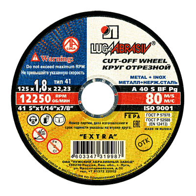 Круг отрезной 125х1,8х22мм А40 по металлу и нержавеющей стали 12250об/мин 80м/с Extra ЛУГА