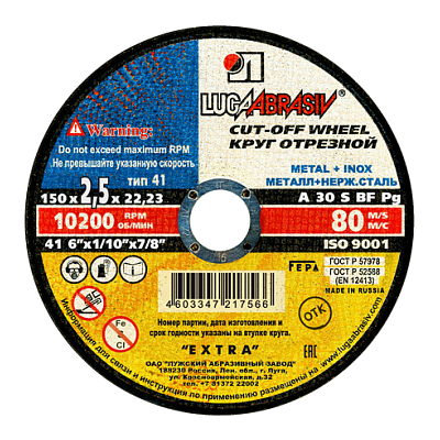 Круг отрезной 150х2,5х22мм А30 по металлу и нержавеющей стали 10200об/мин 80м/с Extra ЛУГА