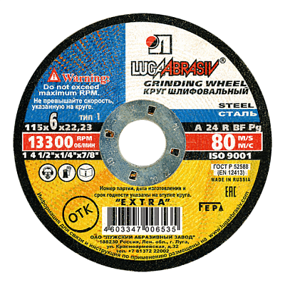 Круг отрезной 115х3,0х22мм А24 по металлу и нержавеющей стали 13300об/мин 80м/с Extra ЛУГА
