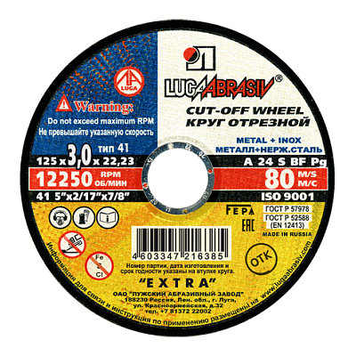 Круг отрезной 125х3,0х22мм А24 по металлу и нержавеющей стали 12250об/мин 80м/с Extra ЛУГА