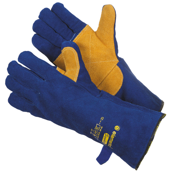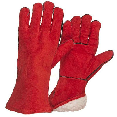 Краги из высококачественного спилка синего цвета (толщина 1,2-1,3мм), пятипалые. Ладонь, пальцы усилены дополнительным слоем спилка. Швы усилены кожаными вставками и прошиты огнеупорной нитью KEVLAR.