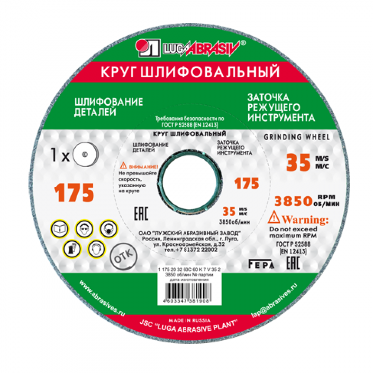 Круг шлифовальный 1 175х20х3мм 64С (зеленый) F60 К,L (среднемягкий) ЛУГА